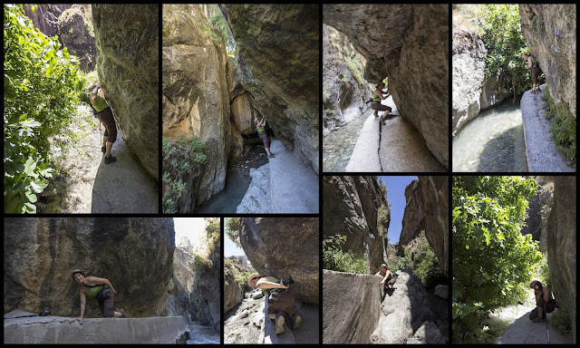 O coração acelera e a adrenalina sobe, um pouco receosa começo a travessia, mas se o receio me acompanhava no inicio,  logo se dissipa perante tal beleza, uma imponente cascata corre abundantemente  em cachos de águas glaciares,  a altura a que me encontro é para mim  vertiginosa,  mas não me contenho,  sem prender pedaços daquela imensidão na minha câmara fotográfica. Passada a ponte, o percurso continua por uma estreita calçada de cimento, encostada a paredes com mais de 30 metros de altura, este  estreito trilho de cimento tem a função de cobrir e proteger  uma conduta de água potável que abastece a povoação de Monachil.  Estávamos no mês de Julho e por tal razão,  o leito do rio corria vagarosamente, o caminho vai-se estreitando, a ponto de nos vermos obrigados a percorre-lo agachados ou até mesmo  rastejando, em algum troço do mesmo,  segura-mo-nos a "ferros" que nos servem de apoio e mal nos cabem os pés em piso firme, cada obstáculo desperta em mim risadas de satisfação,  tal criança descobrindo uma nova aventura, quase me sinto personagem de um filme de Indiana Jones. Por fim,  entramos  na parte mais estreita, uma pequena caverna formada pela erosão fluvial / Cueva de Las Palomas/  a luz do dia quase não entra na mesma e o espaço é ínfimo. Terminamos esta etapa do percurso no verdejante  / Cerro de las Uvas/  assim chamado pela  abundância de vinhas em tempos idos.